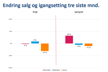 Etter en høst preget av forsiktig oppgang, starter januar 2026 med negative tall. Salget av nye boliger er 31 prosent under januar 2025, og igangsettingen av nye boliger i januar 2026 er det laveste vi har målt for januar måned siden målingene startet i 2010, sier Lars Jacob Hiim, administrerende direktør i Boligprodusentenes Forening.