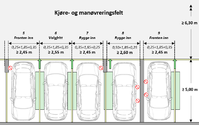 Boligprodusentene har utarbeidet en bransjenorm for størrelse på parkeringsplasser i garasjeanlegg. Bransjenormen er primært beregnet på parkeringsplasser i innendørs garasjeanlegg, men er også relevant for utendørs parkering. Bransjenormen beskriver ikke størrelse på parkeringsplasser i carporter og små garasjer. Heller ikke størrelse på parkeringsplasser for forflytningshemmede.