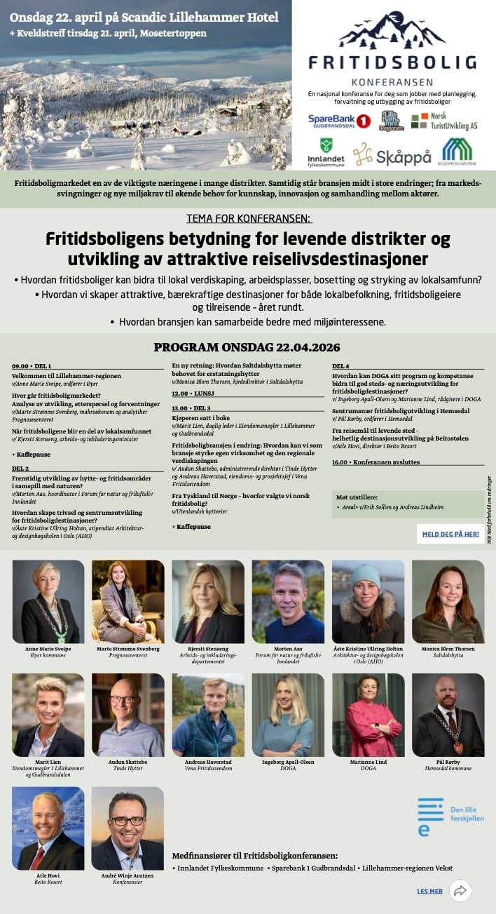 Fritidsboligkonferansen gjennomføres på Lillehammer onsdag 22. april 2026, og det blir kveldstreff dagen i forveien, tirsdag 21. april. Konferansen er den viktigste nasjonale møteplassen for alle som jobber med eller påvirkes av fritidsboligutvikling i Norge. Her samles aktører fra politikk, næringsliv, planlegging og destinasjonsutvikling for å diskutere bransjens store endringer, fra markedssvingninger og miljøkrav til behovet for kunnskap og bedre samhandling.