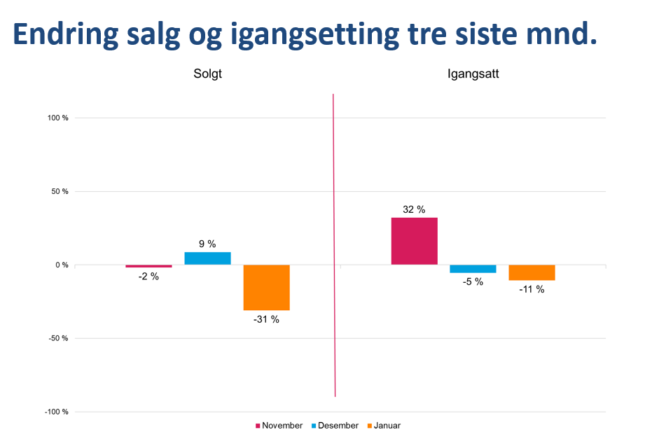- Solgte nye boliger i januar 2026 er 31 prosent under januar 2025.