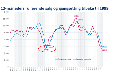 Salg og igangsetting av nye boliger er det laveste vi har registrert for februar måned siden vi begynte med månedlig registeringer i 2010, sier administrerende direktør Lars Jacob Hiim i Boligprodusentenes Forening. Igangsatte boliger i siste tolvmånedersperiode (fom. mars 2023 tom. februar 2024) er 13 642 boenheter. Det er det svakeste vi har målt siden vi startet med målinger i 1999, og halvparten av det beregnede boligbehovet.