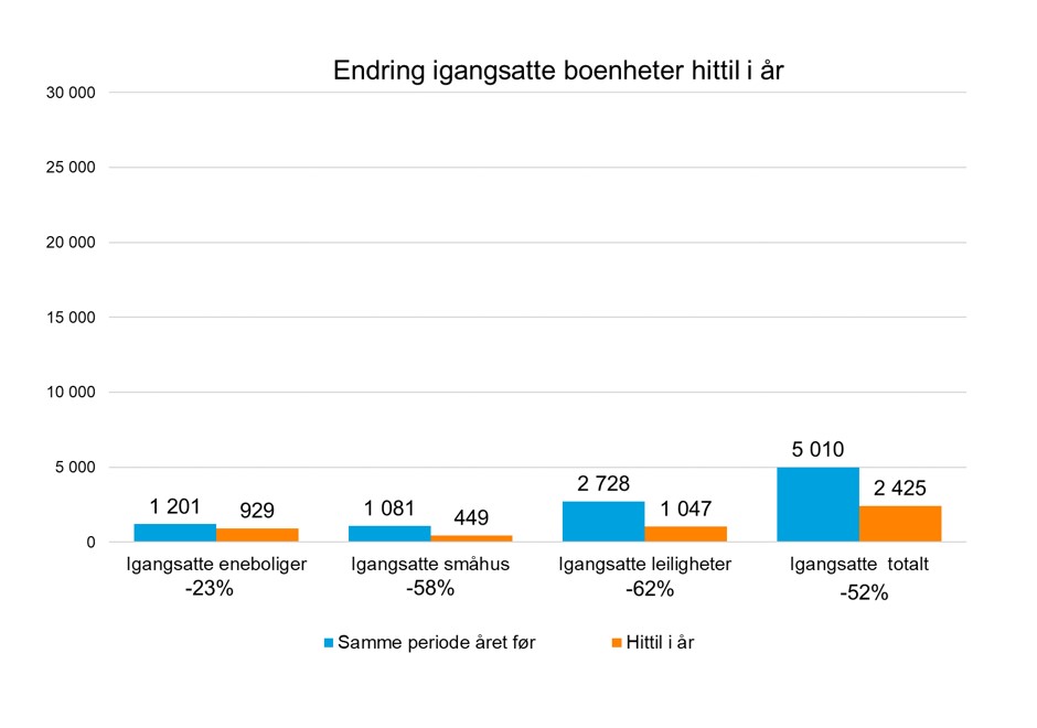 19.04.2023 | Statistikk, Pressemeldinger Pressemelding - Aldri målt svakere salg og igangsetting i første kvartal Nå har vi en dramatisk nedgang i salg og igangsetting av nye boliger. Vi ikke målt svakere første kvartal, siden vi startet med målinger i 1999, sier adm. direktør i Boligprodusentenes Forening, Lars Jacob Hiim.