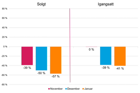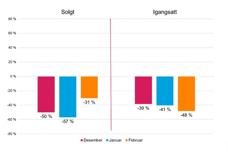 15.03.2023 | Boligpolitikk, Statistikk Nyboligmarkedet er fortsatt i fritt fall Igangsetting av nye boliger i februar er nesten halvert sammenlignet med februar 2022, sier administrerende direktør i Boligprodusentene Lars Jacob Hiim. Det er svært lavt salg og igangsetting for alle boligtyper i hele landet.