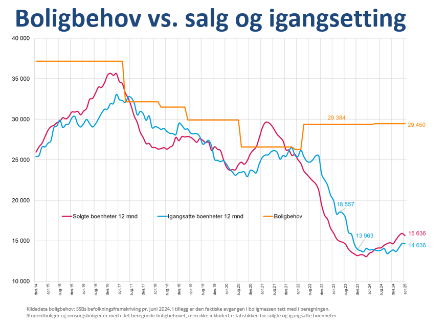Salget av nye boliger falt 20 prosent i april 2025 sammenlignet med april 2024. Den positive starten av 2025 har stoppet opp, sier administrerende direktør i Boligprodusentene Lars Jacob Hiim. Avlyst rentenedgang, handelskrig, økte byggekostnader og utflating av bruktboligprisene hadde umiddelbar effekt på boligsalget i slutten av mars og begynnelsen av april, forteller Hiim.