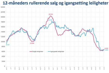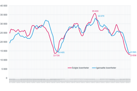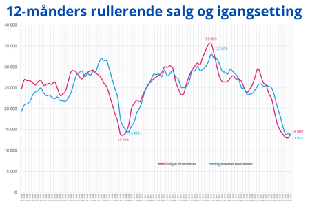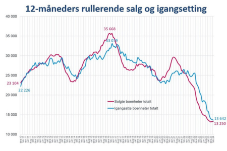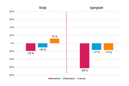 Salgstallene i januar gir håp om at vi har nådd bunnen på salg av nye boliger, sier administrerende direktør i Boligprodusentene Lars Jacob Hiim. Det er særlig småhusmarkedet rundt storbyene som har en positiv tendens i januar. Vi ser fortsatt fallende byggeaktivitet, igangsettingen faller med 17 prosent sammenlignet med januar 2023. Nyboligmarkedet er fortsatt på et historisk lavt nivå, og det blir en svært tøff vinter for bransjen, påpeker Hiim.